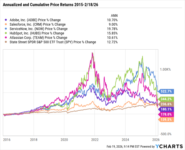 Markets often over extrapolate narratives in the short run as simple truths can lead to valuation re-ratings followed by momentum driven herd behavior and panic selling. The math of negative returns is brutal. A 60% decline in share prices can quickly wipe out much of your paper gains accumulated over a decade. The SaaS group used in this article had compound annual returns of between 17.6% and 32.3% from 12/31/15 to 12/31/24, with even the weakest returner handedly outperforming the S&P 500 return of 14.4%. Fast forward to present, and only ServiceNow and HubSpot are still outperforming the S&P since the end of 2015.
